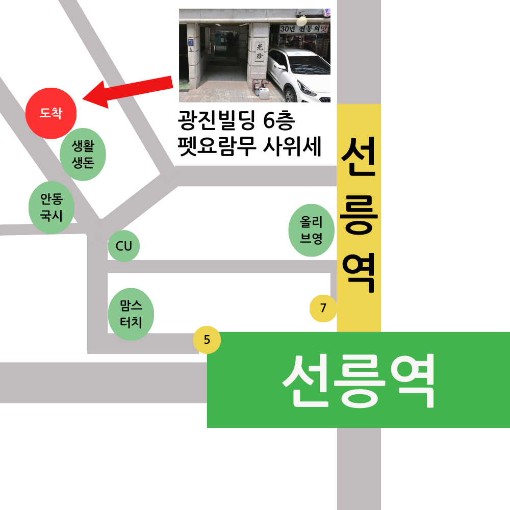 위치 서울 강남구 테헤란로51길 18, 6층 광진빌딩 펫요람무 사위세